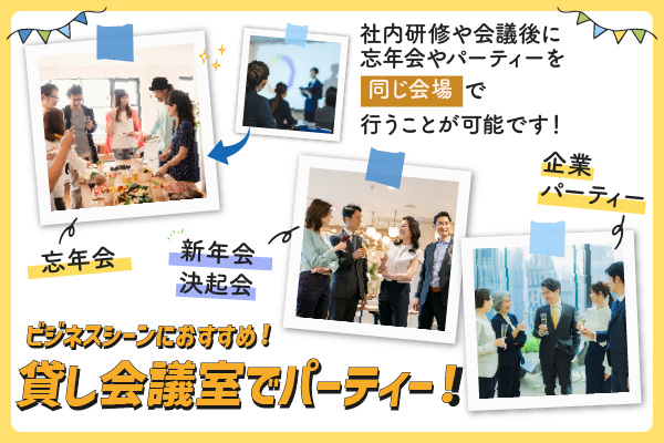 年末年始の忘年会・新年会会場が満席でお困りですか?貸し会議室なら研修やセミナーの後、そのままパーティー開催が可能!移動不要で幹事の負担も軽減。TIME SHARINGで効率的なイベント開催を実現しましょう。