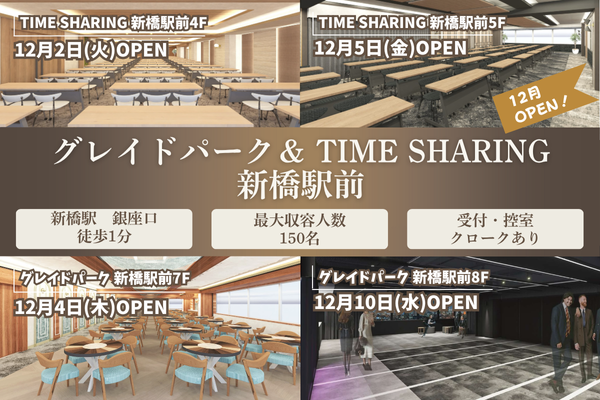 2025年12月、新橋駅徒歩1分に貸し会議室「TIME SHARING新橋駅前」とイベントスペース「グレイドパーク新橋駅前」が4フロア同時オープン。12月11日無料内覧会開催、アンケート回答で特典プレゼント。会議から懇親会まで同一ビルで完結する利便性と充実設備が魅力。