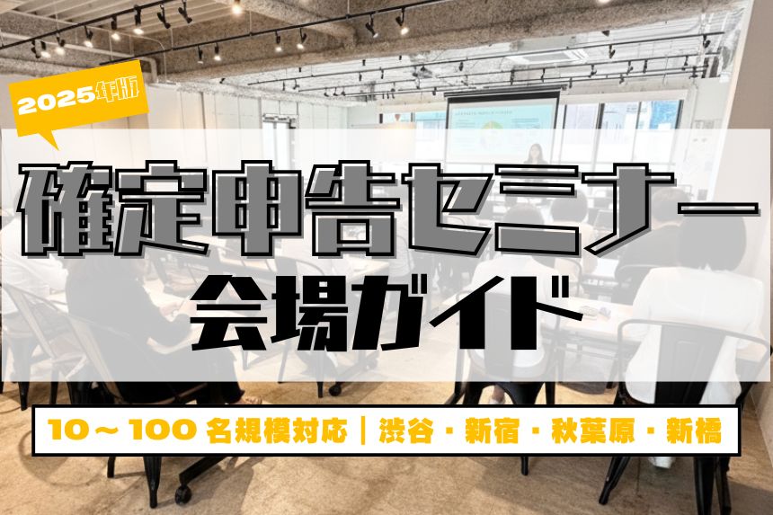確定申告セミナーの会場選びで失敗しない方法を完全解説。少人数18名〜大人数108名まで、参加者規模に合わせた東京のおすすめ会場を渋谷・新宿・秋葉原・新橋エリア別に紹介。駅近・設備充実・即日予約可能なTIME SHARINGスペース情報付き。
