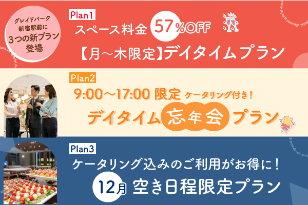 新宿駅直結のグレイドパーク新宿駅前に忘年会向け3つの限定プランが登場!デイタイムプランは最大57%OFF、12月空き日程限定プランは最低保証料金が110,000円もお得。最大300名対応の充実設備で年末イベントを成功させましょう。