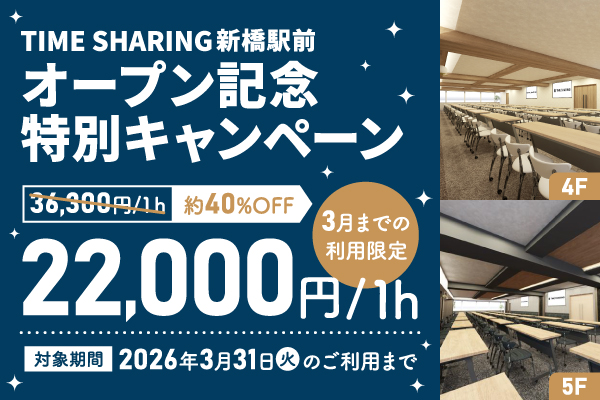【期間限定40%OFF】TIME SHARING新橋駅前4F&5Fオープン記念!2026年3月まで特別価格22,000円/1h