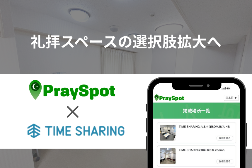 TIME SHARINGの会場が、訪日・在住ムスリム向け礼拝スペース予約プラットフォーム「PraySpot」に掲載開始。多様な文化・宗教的背景を持つ方々が利用しやすい環境づくりと、新たなスペース活用の取り組みについてご紹介します。
