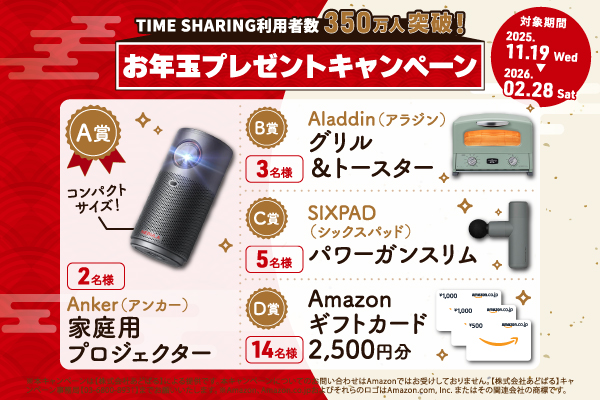 【累計利用者数350万人突破記念】TIME SHARINGお年玉プレゼントキャンペーン開催!Ankerプロジェクターやアラジントースターが当たる
