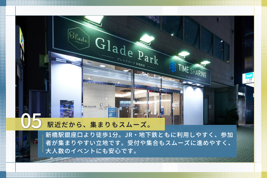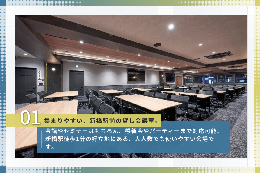 新橋駅銀座口より徒歩1分というアクセスの良さも、この会場の大きな特長です。 JR・地下鉄ともに利用しやすく、都内各所からのアクセスも良好。遠方からの参加者を招くイベントや、 業務後に集まる懇親会、複数部署が集まる社内イベントなどでも、参加しやすい会場として活用できます。