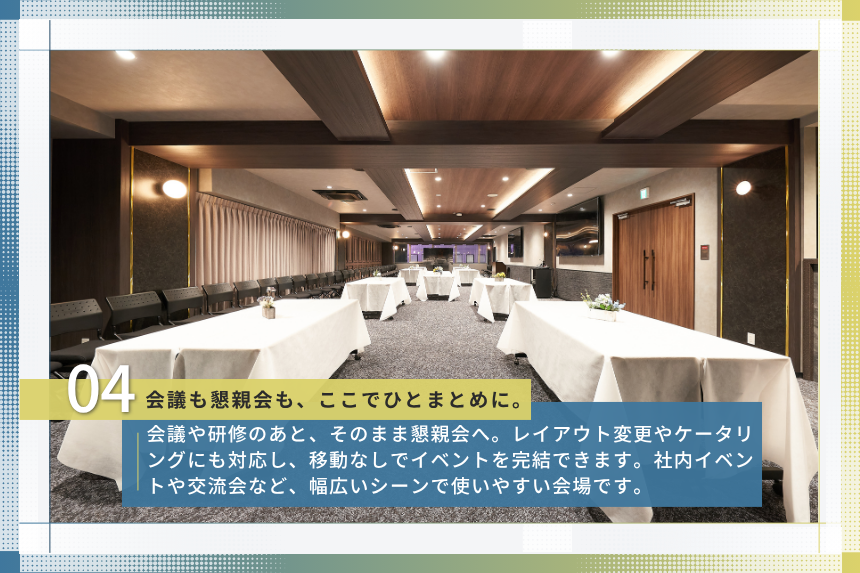 会議・セミナー・研修はもちろん、懇親会やパーティーまで対応可能。