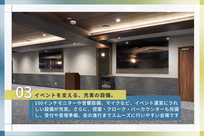 メインフロアは約183㎡の広々とした空間。 スクール形式108名、立食150名まで対応可能で、大人数が集まるイベントにも適しています。 セミナーや研修、説明会、キックオフミーティングなど、しっかり座席を設けたいシーンにも対応しやすく、 一方で立食形式の交流会や懇親会では、ゆとりを持ったレイアウトで会場を活用できます。